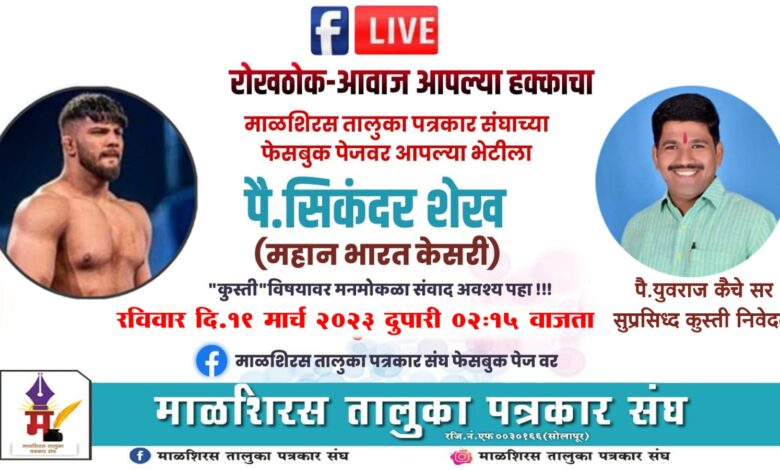 संपूर्ण देशभरात आपल्या कुस्तीने धुमाकूळ घालणारा सोलापूर जिल्ह्यातील मोहोळ येथील नामांकित मल्ल पै सिकंदर शेख हा माळशिरस तालुका पत्रकार संघाच्या फेसबुक पेजवर लाईव्ह मुलाखतीसाठी रविवार दि 19 मार्च रोजी दुपारी 02:15 वाजता येणार आहे तरी तमाम कुस्ती शौकिनांनी ही मुलाखत माळशिरस तालुका पत्रकार संघाच्या फेसबुक पेजवर लाईव्ह पाहून आपलेही प्रश्न विचारावेत असे आवाहन माळशिरस तालुका पत्रकार संघाचे अध्यक्ष संजय देशमुख यांनी केले आहे.
