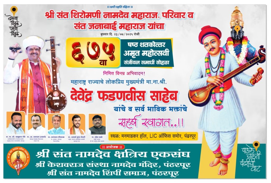 श्री संत शिरोमणी नामदेव महाराज परिवार व संत जनाबाई महाराज यांचा बुधवार दि 23 जुलै रोजी 675 वा (षष्ठ शतकोत्तर) अमृत महोत्सवी संजीवन समाधी सोहळा पंढरपूर येथे मनमाडकर हॉल, एलआयसी ऑफिस समोर श्री संत नामदेव क्षत्रिय एकसंग, श्री केशवराज संस्था नामदेव मंदिर पंढरपूर, श्री संत नामदेव शिंपी समाज पंढरपूर यांच्या संयुक्त विद्यमाने पंढरपूर येथे आयोजित केला असून या कार्यक्रमासाठी राज्याचे मुख्यमंत्री देवेंद्र फडणवीस हे बुधवार दिनांक 23 जुलै रोजी पंढरपूर येथे या कार्यक्रमासाठी येत असल्याची माहिती कार्यक्रमाचे संयोजक व श्री संत नामदेव क्षेत्रीय एकसंगचे राष्ट्रीय अध्यक्ष महेश ढवळे यांनी दिली.